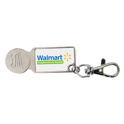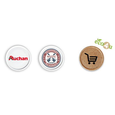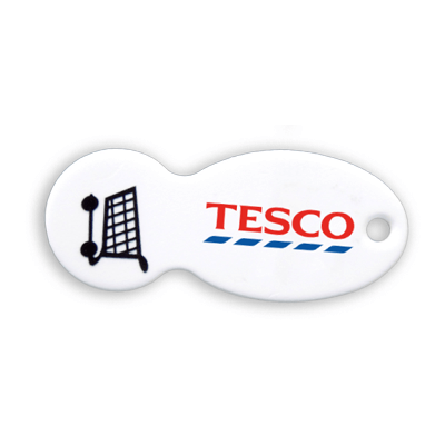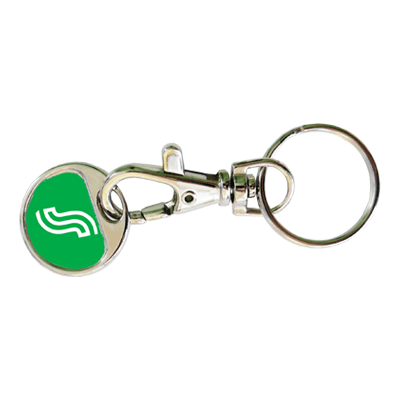 Plastic keychain composed of a plastic keyring and a removable trolley token, both available in different colours with customisable prints.